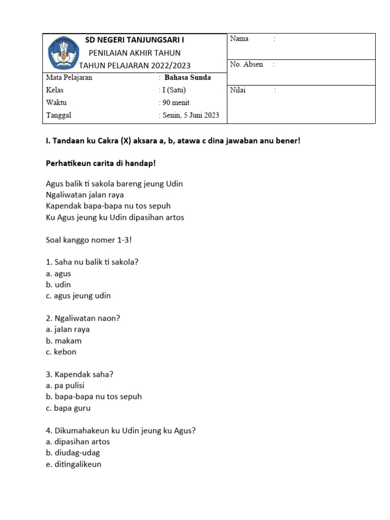 Ieu di handap conto soal latihan ulangan basa Sunda kelas 1 semester 2: